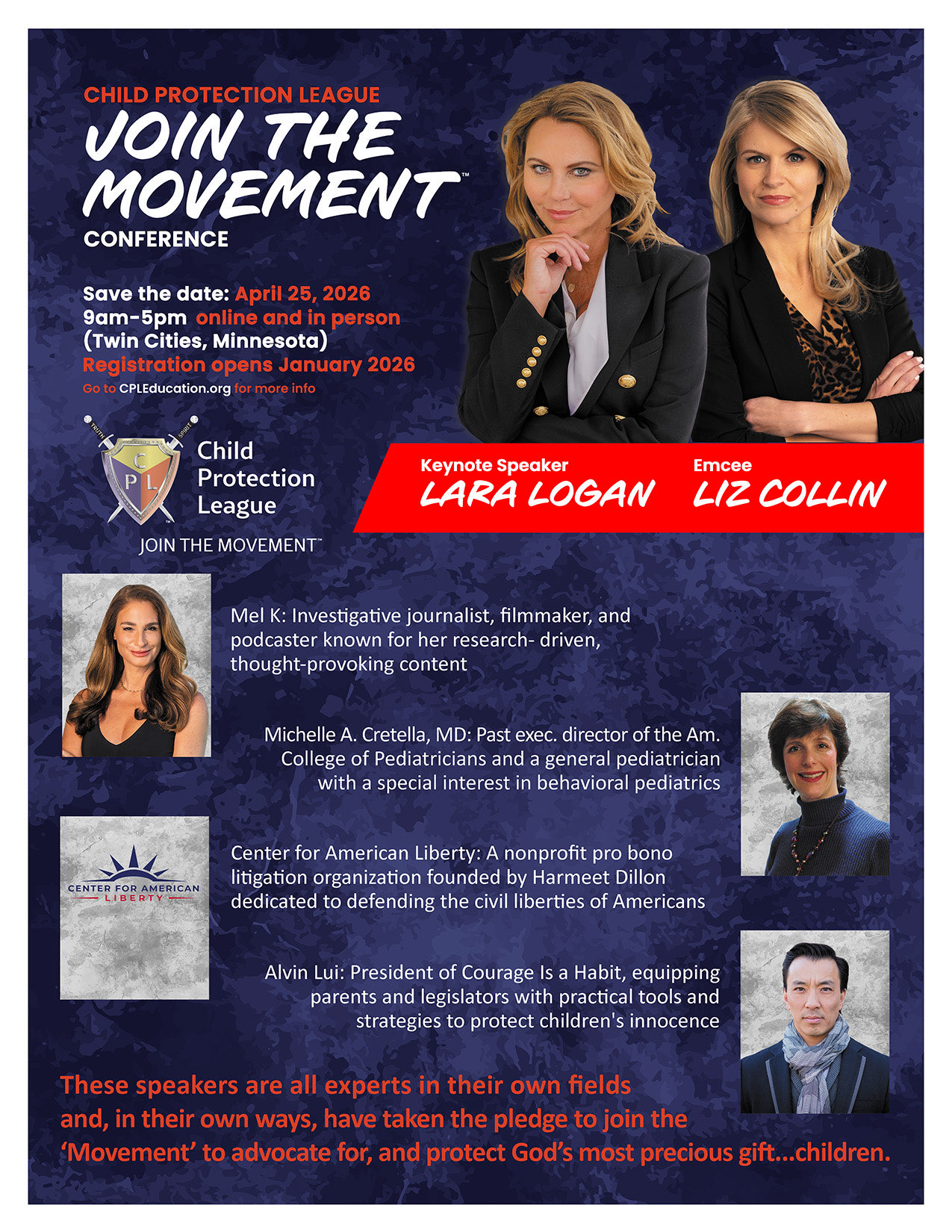 Lara and Liz are two of the most courageous and outstanding journalists of our time. They and the rest of the speakers understand who is targeting the hearts, minds and bodies of our children, how they are doing it and why. You will hear from nationally recognized experts like Dr. Michelle Cretella, popular podcaster Mel K of the Mel K Show, an attorney from the nonprofit law firm Center for American Liberty (founded by Harmeet Dillon in 2018) and the founder of the cutting edge organization Courage is a Habit, Alvin Lui!