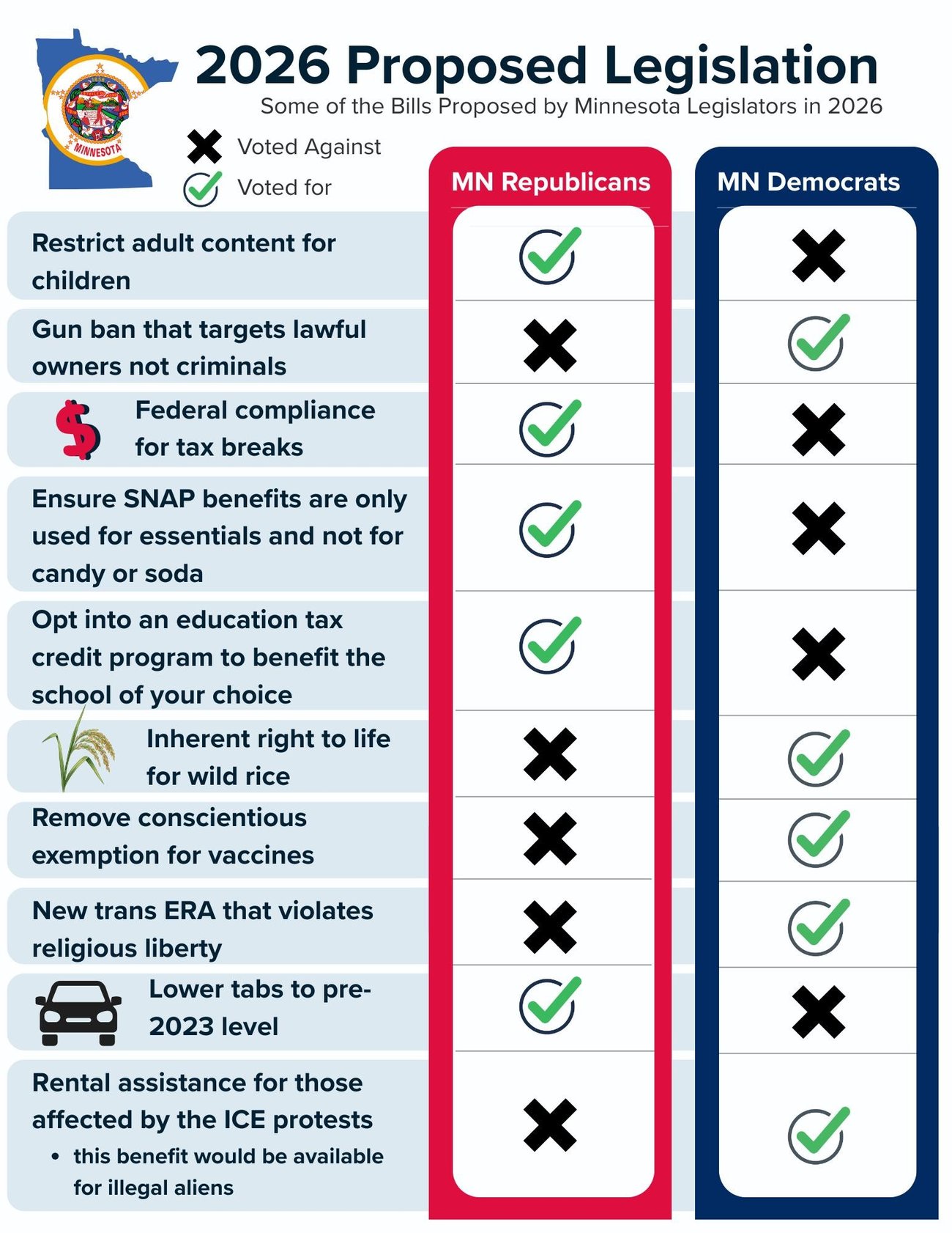 This year the democrats have control of the MN Senate, Governor and Constitutional officers, and the MN House remains split 50/50. This means both parties have to work together to get legislation passed. This could have been an opportunity to put partisanship aside and focus on what is best for Minnesotans. Unfortunately, each party has an ever increasingly different viewpoint of what is in the best interest for Minnesota. The following is a list of priorities set forth by the political parties this year.